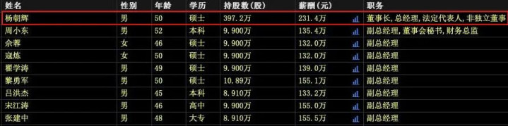 九位高管的平均薪酬在150万元左右,其中,杨朝辉待遇最佳,达到231.4万元。